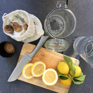 Mettre dans le pot Le Parfait, vos grains de Kéfir, le sucre, la rondelle de citron, la figue. Mettre dans un endroit à l’abri de la lumière et à température ambiante. J’ai mis le tout dans un placard en me mettant un rappel sur mon téléphone.