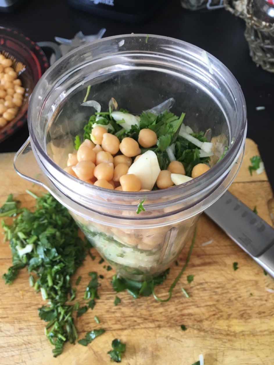 • Mixer séparément l’oignon épluché et émincé, et ajouter le tout dans les pois chiches. Ajouter la coriandre rincée, feuilles et tiges, que vous avez coupés préalablement en petits tronçons. Attention à bien faire séchée les feuilles pour qu’elles s’agglomèrent bien à la préparation.