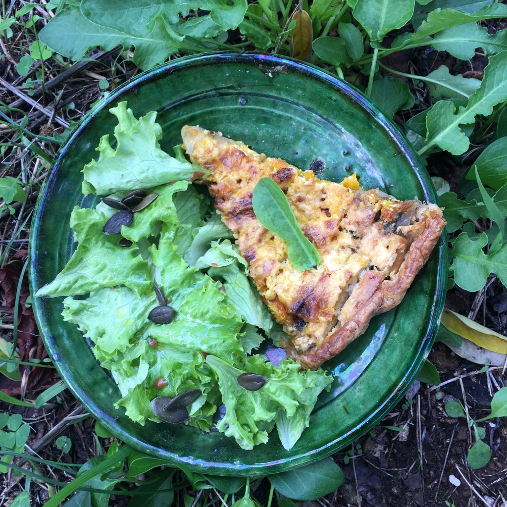 Ici , une photo de quiche vegan avec de la patience-violon servie avec une salade.